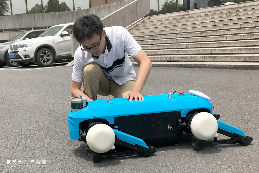 1/0浙江大學(xué)控制科學(xué)與工程學(xué)院的學(xué)生趙逸棟在查看“四足機(jī)器人——絕影”的電機(jī)溫度并進(jìn)行調(diào)試。(謝沂楠/ 攝 姚振/文)