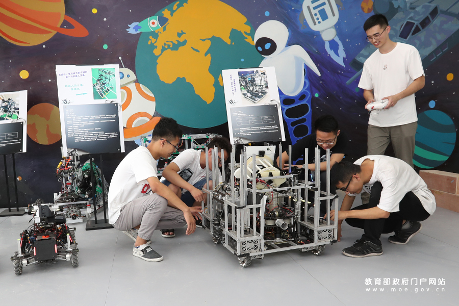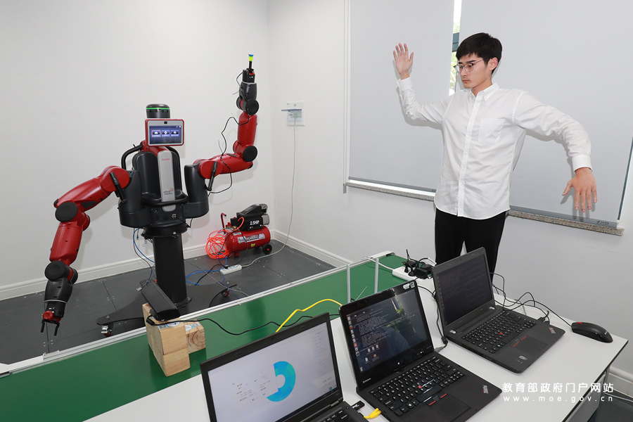 在四川大學(xué)智能感知與先進控制創(chuàng)新工坊,團隊帶頭人吳文強正在為同學(xué)們演示操作工程車機器人。(張勁松/攝 忠建豐/文)