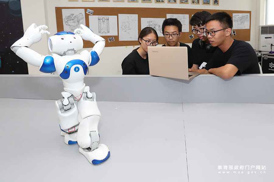 在四川大學(xué)智能感知與先進控制創(chuàng)新工坊,四川大學(xué)機器人足球隊隊員通過電腦程序操作機器人“nao”跳舞。(張勁松/攝 忠建豐/文)