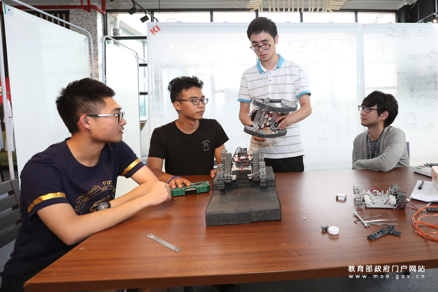 在四川大學(xué)匹茲堡學(xué)院iLife智慧工坊,團隊帶頭人梁棟正在給同學(xué)們介紹全地形越障小車機器人結(jié)構(gòu)和越障原理。(張勁松/攝 忠建豐/文)