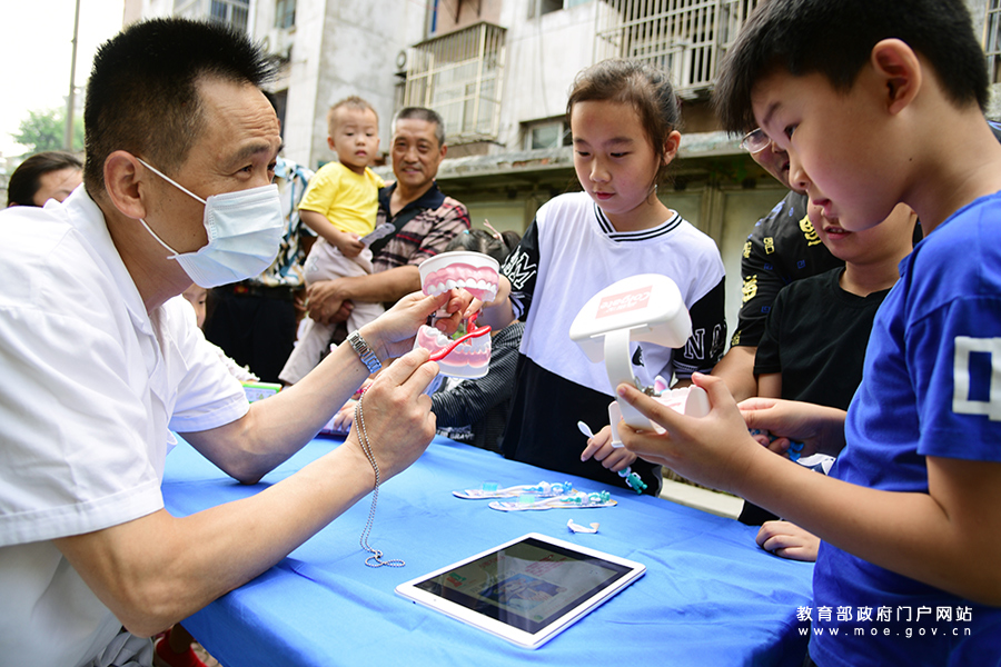 1/0老黨員在向小朋友介紹他收藏的老式字典。(石玉成/攝)