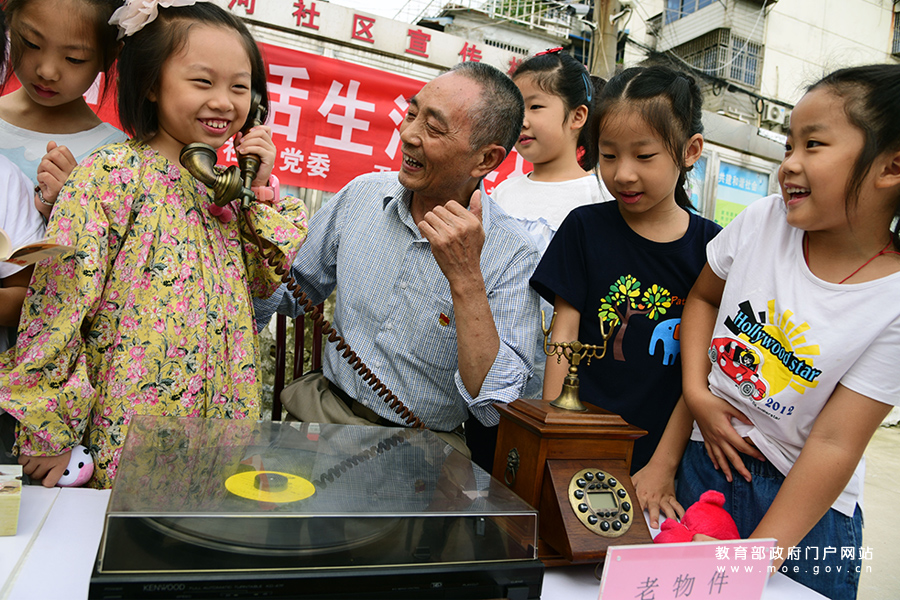 1/0老黨員帶著小朋友體驗(yàn)老式電話機(jī)的使用。(石玉成/攝)