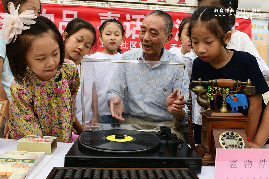 1/0老黨員在向小朋友介紹老式電唱機(jī)的使用方法。(石玉成/攝)