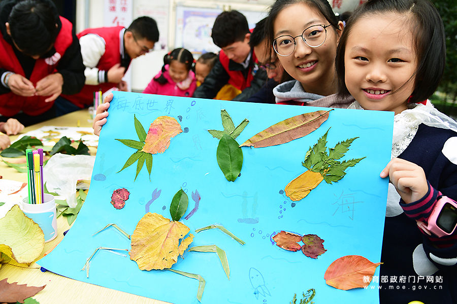 小朋友和志愿者在展示用落葉拼貼的創(chuàng)意環(huán)保畫。(石玉成 李文達(dá)/攝)