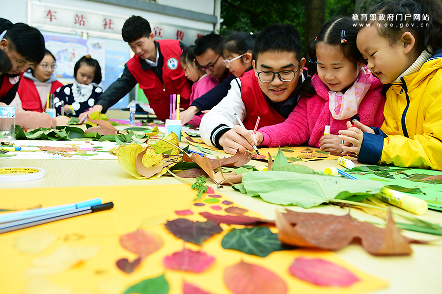 志愿者在指導(dǎo)小朋友用落葉制作創(chuàng)意環(huán)保畫。(石玉成 李文達(dá)/攝)