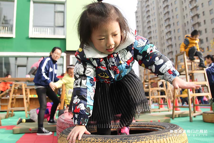 1/0上城名府幼兒園中(3)班的小朋友正在攀爬輪胎,這個游戲可以鍛煉孩子的平衡能力、四肢協(xié)調(diào)能力以及孩子的自信心。為貫徹落實(shí)黨的十九大精神和全國教育大會精神,聚焦教育系統(tǒng)長期以來的熱點(diǎn)難點(diǎn)問題,11月29日,由教育部新聞辦組織的教育奮進(jìn)之筆“1+1”系列發(fā)布采訪活動走進(jìn)山東,就學(xué)前教育深化改革規(guī)范發(fā)展情況走訪了淄博市高新區(qū)上城名府幼兒園。該園是淄博市高新區(qū)新建居民小區(qū)的配套幼兒園,與小區(qū)同步規(guī)劃、建設(shè)和交付使用,提供350個幼兒園學(xué)位,有效的解決了小區(qū)幼兒“入園難”的問題。(單藝偉/攝 忠建豐/文)