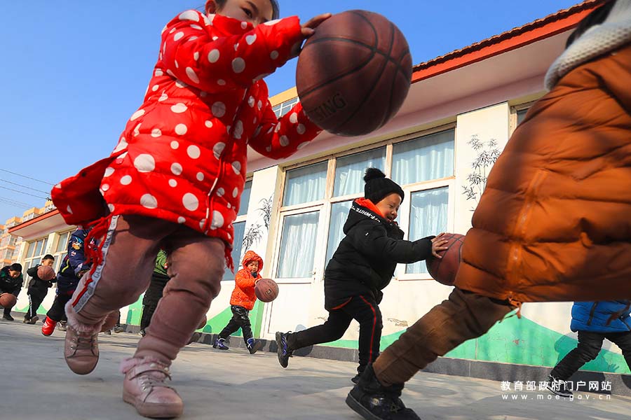 1/0賈家營(yíng)鎮(zhèn)中心幼兒園小朋友帶球跑步,鍛煉身體。(張學(xué)軍/攝)