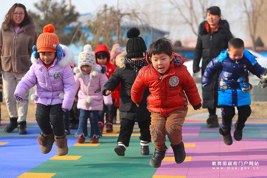 1/0賈家營(yíng)鎮(zhèn)中心幼兒園小朋友在操場(chǎng)上奔跑跳躍,提高抗寒能力,磨練意志品質(zhì)。(張學(xué)軍/攝)