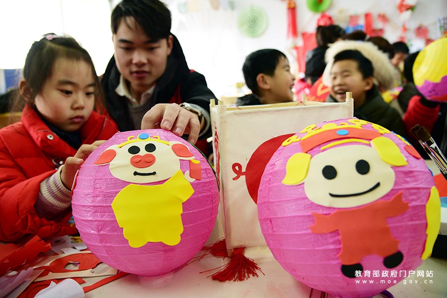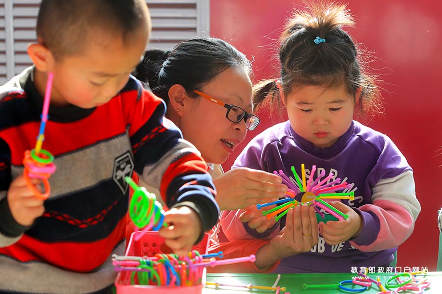 1/0賈家營(yíng)鎮(zhèn)中心幼兒園老師手把手地教小朋友做手工。(張學(xué)軍/攝)