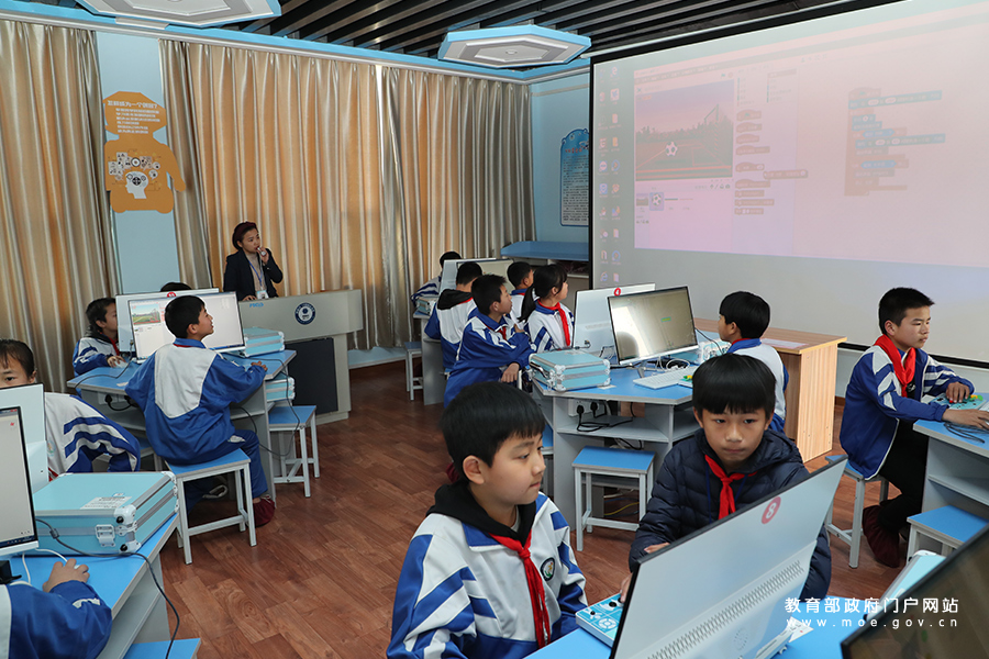 在少年宮的創(chuàng)客教室里,老師正在為學(xué)生講解少兒編程軟件使用的相關(guān)知識(shí)。(張勁松/攝 姚振/文)