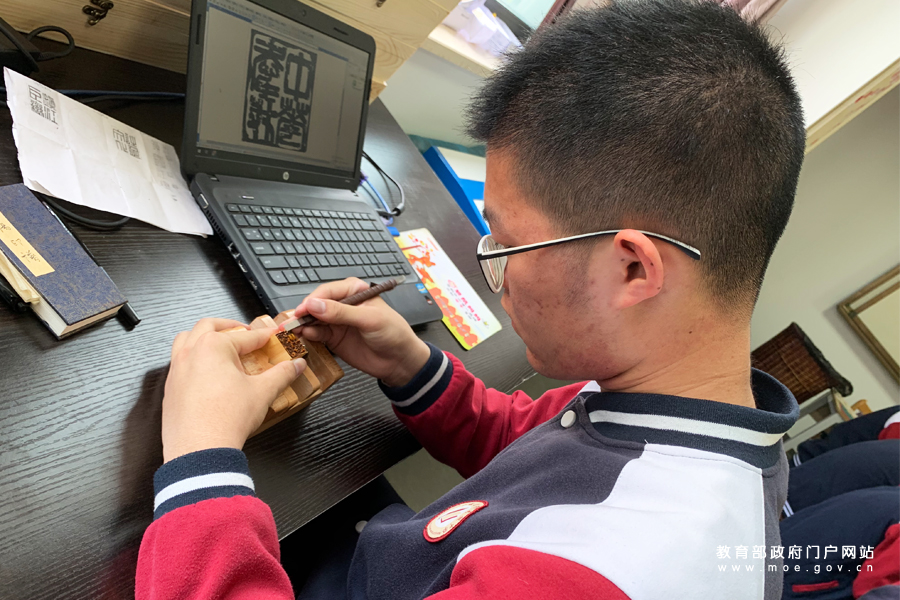 1/0高二年級(jí)的王晨陽(yáng)已經(jīng)學(xué)習(xí)篆刻一年多,在他看來(lái),從篆刻中學(xué)到最重要的專業(yè)知識(shí)是如何將刻畫的失誤轉(zhuǎn)化為成品中的亮點(diǎn)。(謝沂楠/攝 俞曼悅/文)