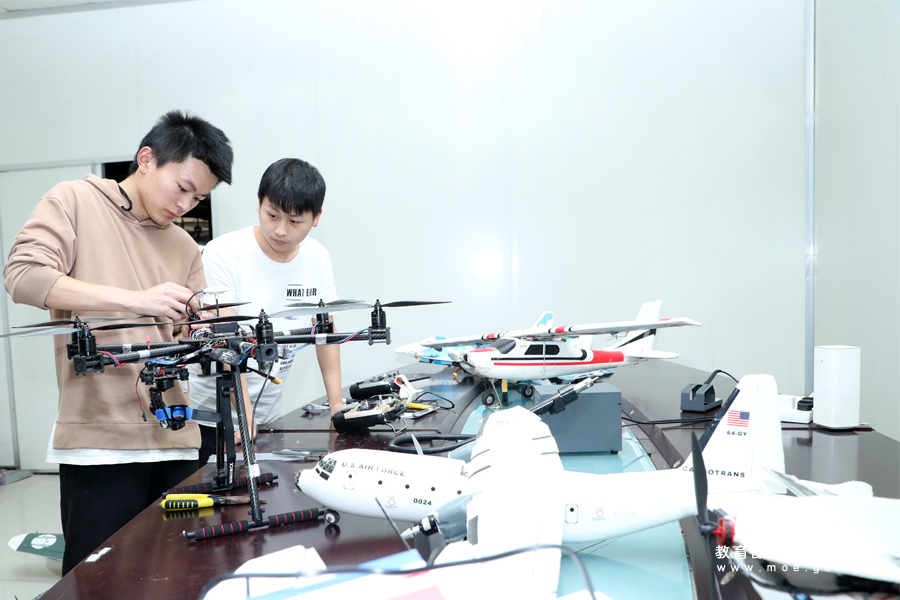 重慶電子工程職業(yè)學(xué)院智能制造與汽車學(xué)院無(wú)人機(jī)應(yīng)用技術(shù)專業(yè)2019級(jí)學(xué)生蹇冬池(左)與周林康(右)正在拼裝無(wú)人機(jī)。(張勁松/攝 忠建豐 謝沂楠/文)