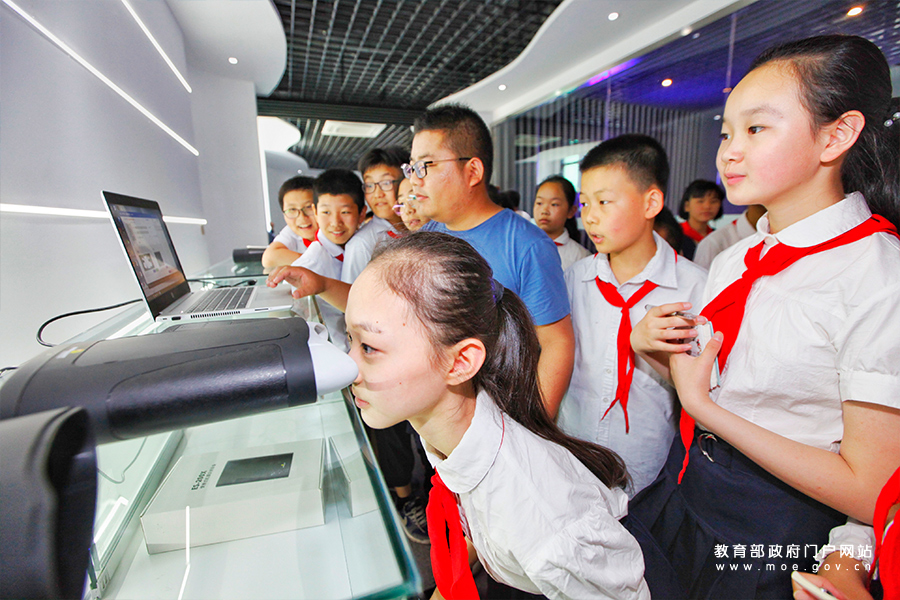 徐州市民主實驗學(xué)校學(xué)生在園區(qū)體驗虹膜采集識別設(shè)備。(蒯創(chuàng)/攝)