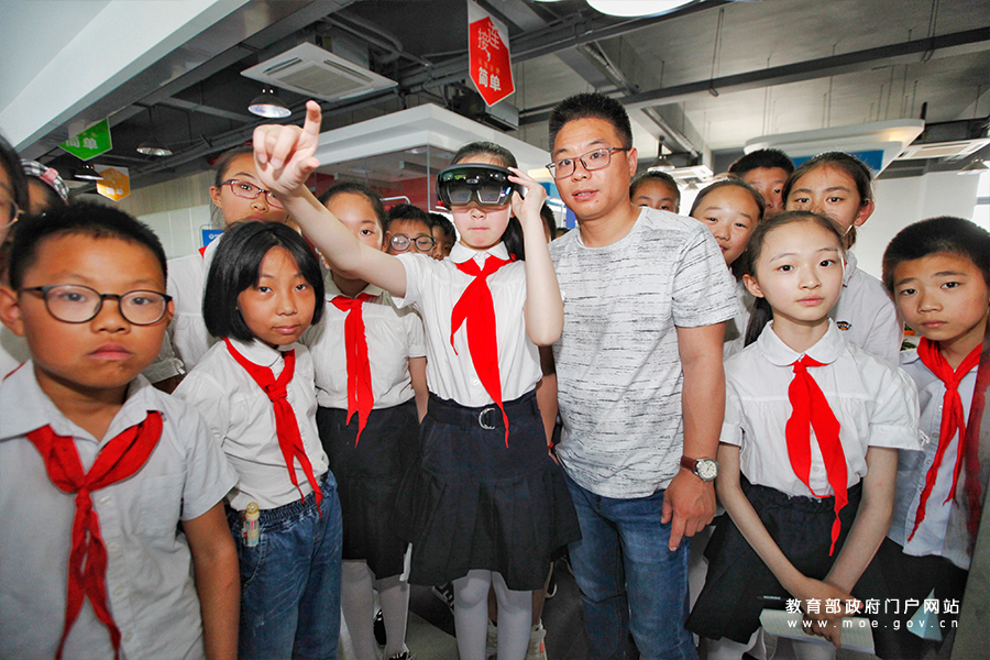 徐州市民主實驗學(xué)校學(xué)生在園區(qū)體驗VR產(chǎn)品HoloLens全息影像操作。(蒯創(chuàng)/攝)