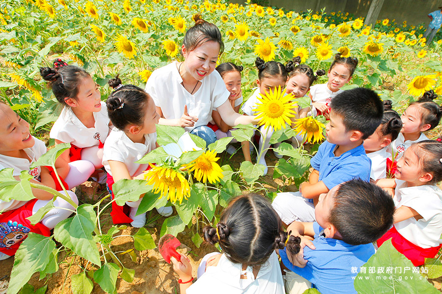 7月3日,玉潭實驗學(xué)校的老師為學(xué)生講解向日葵生長知識。(蒯創(chuàng)/攝)