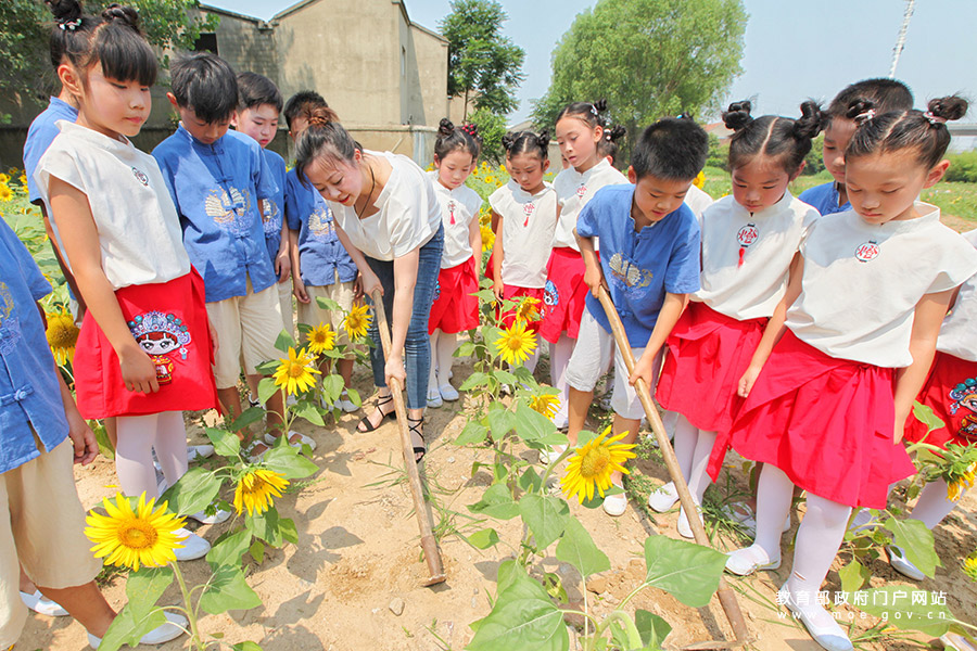 7月3日,玉潭實驗學(xué)校的老師帶領(lǐng)學(xué)生體驗松土勞動。(蒯創(chuàng)/攝)