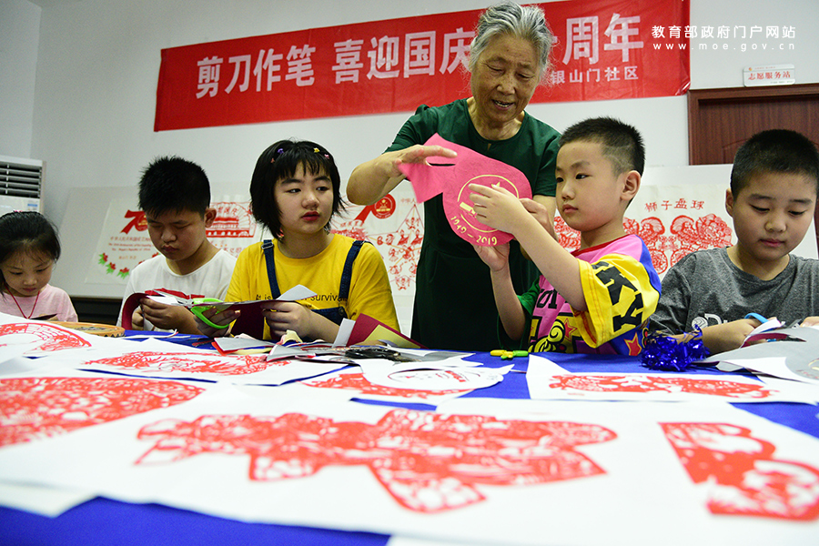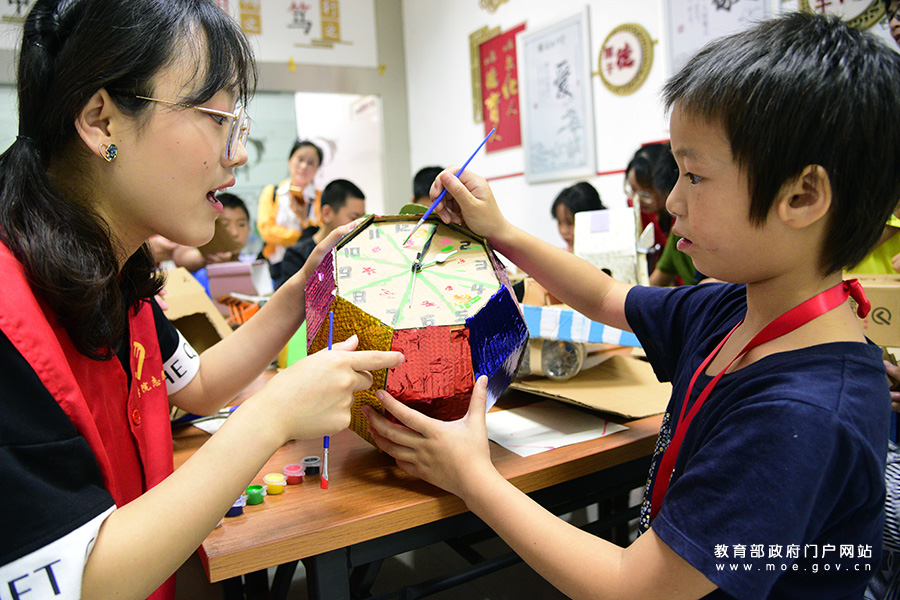 在江蘇省鎮(zhèn)江市金橋社區(qū),江蘇大學(xué)志愿者在指導(dǎo)小朋友用廢舊快遞盒制作環(huán)保工藝品。(石玉成 周存君/攝)