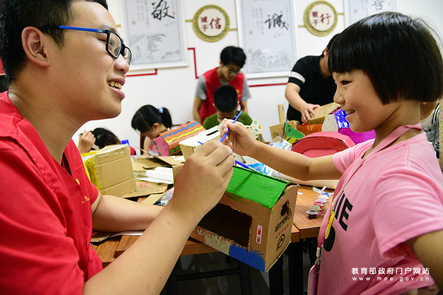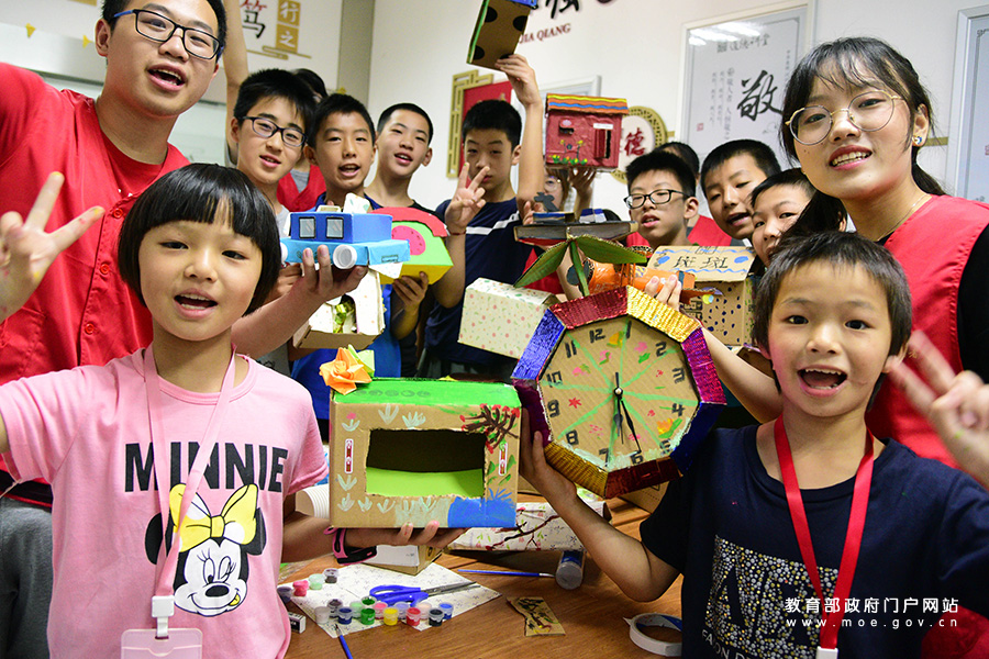 江蘇大學(xué)志愿者在指導(dǎo)小朋友用廢舊快遞盒制作工藝品。正值暑假,江蘇大學(xué)的志愿者走進鎮(zhèn)江市寶塔路街道金橋社區(qū),開展“快遞盒‘變廢為寶’倡環(huán)?!被顒?,指導(dǎo)小朋友們用收集的快遞盒制作鐘表、汽車模型等創(chuàng)意環(huán)保工藝品。孩子們在活動中增強了動手能力,培養(yǎng)了節(jié)約資源的環(huán)保意識,豐富了假期生活。(石玉成 周存君/攝)
