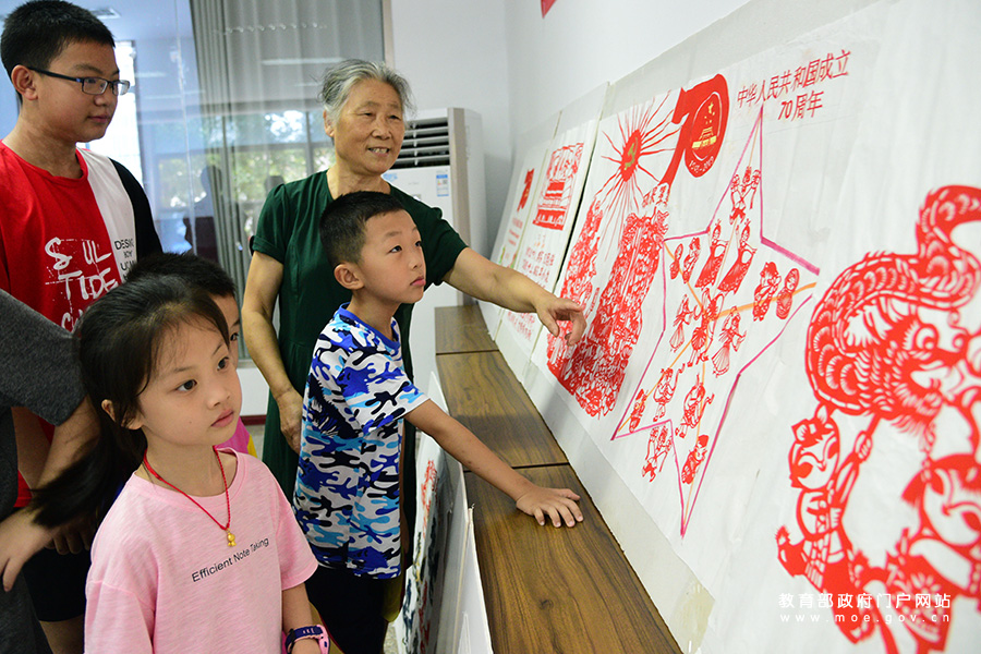 剪紙愛好者尹桂蘭向小朋友們介紹她創(chuàng)作的慶祝新中國成立70周年剪紙作品。(石玉成/攝)