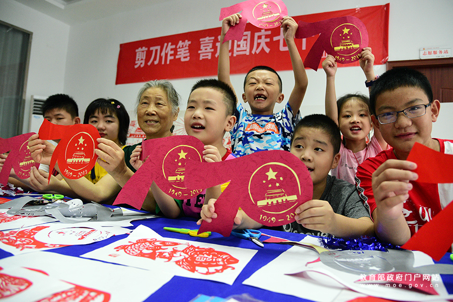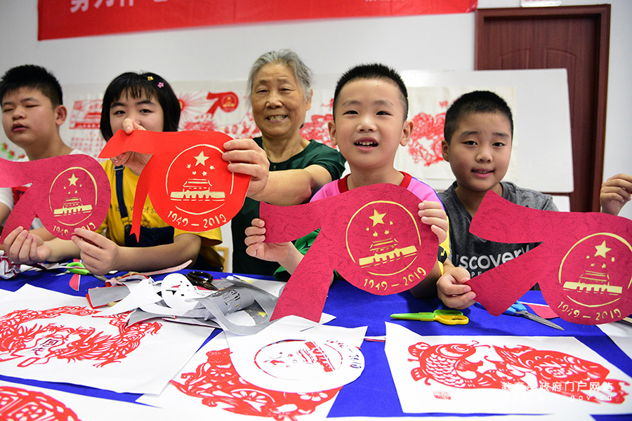 尹桂蘭和小朋友們一起展示“慶祝中華人民共和國成立70周年活動標(biāo)識”剪紙作品。(石玉成/攝)