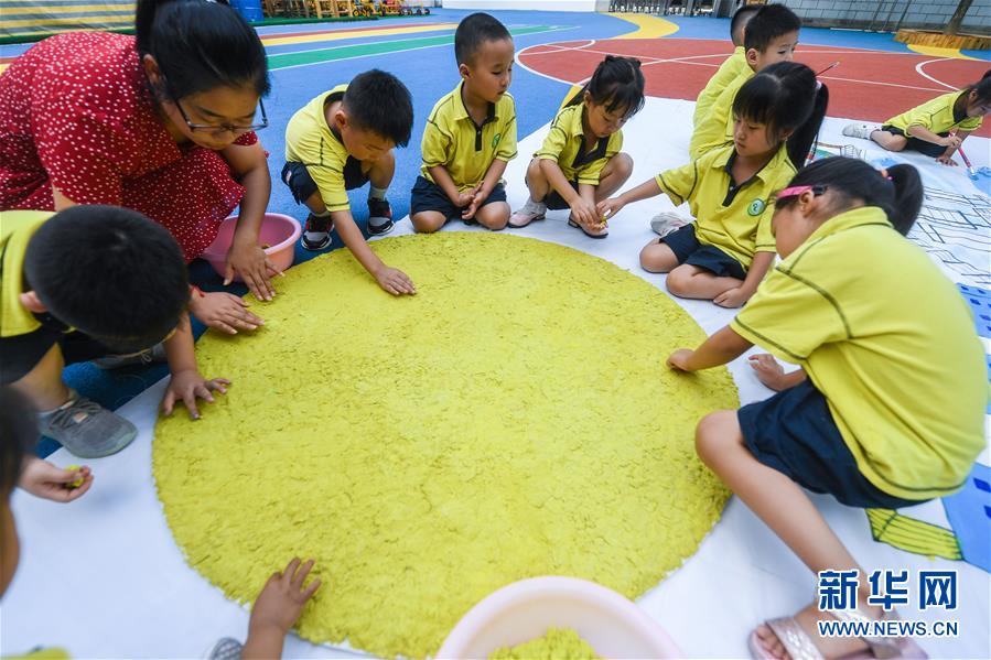 1/09月11日,孩子們在老師的帶領(lǐng)下用廢舊紙漿制作月亮。(新華社記者 徐昱/攝)