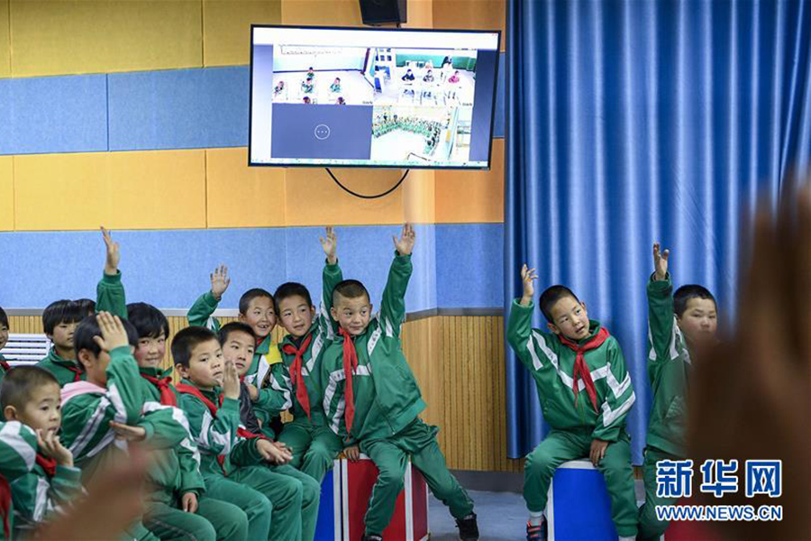 1/010月9日,寧夏固原市涇源縣涇河源鎮(zhèn)高峰村教學(xué)點(diǎn)低年級學(xué)生在課堂上與涇河源鎮(zhèn)白面民族小學(xué)的師生進(jìn)行網(wǎng)絡(luò)互動。(新華社記者 馮開華/攝)