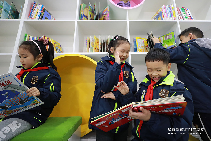 1/011月18日,小學(xué)生在寶葫蘆童話館閱覽室內(nèi)開心地閱讀交流。(王媛、張學(xué)軍/攝)
