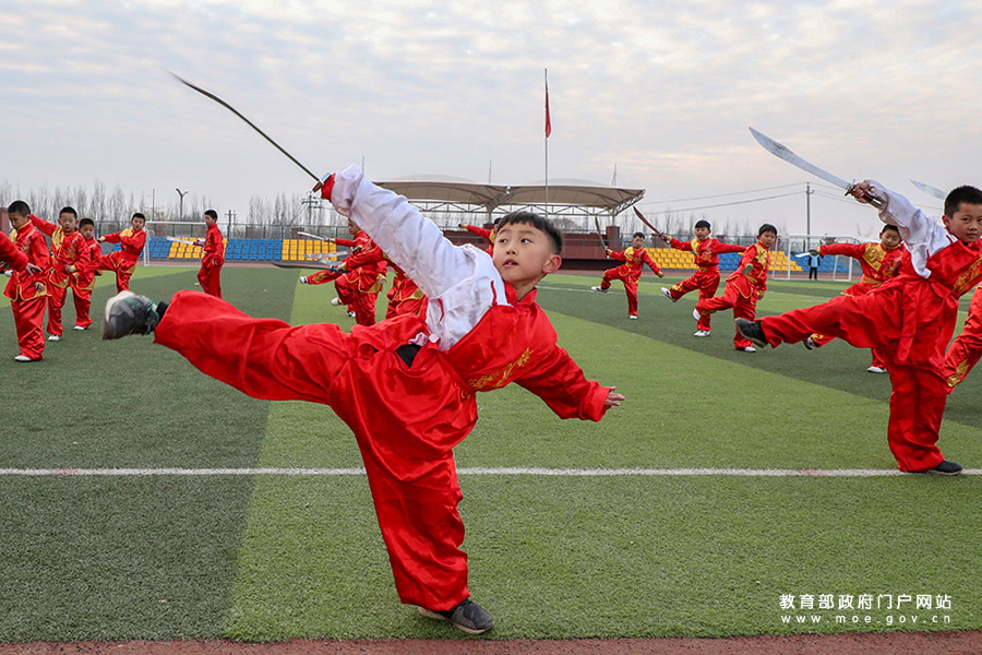 1/0長(zhǎng)治市長(zhǎng)子縣東方紅學(xué)校武術(shù)社團(tuán)的學(xué)生正在演練少兒武術(shù)刀。(張勁松/攝 張勁松/文)