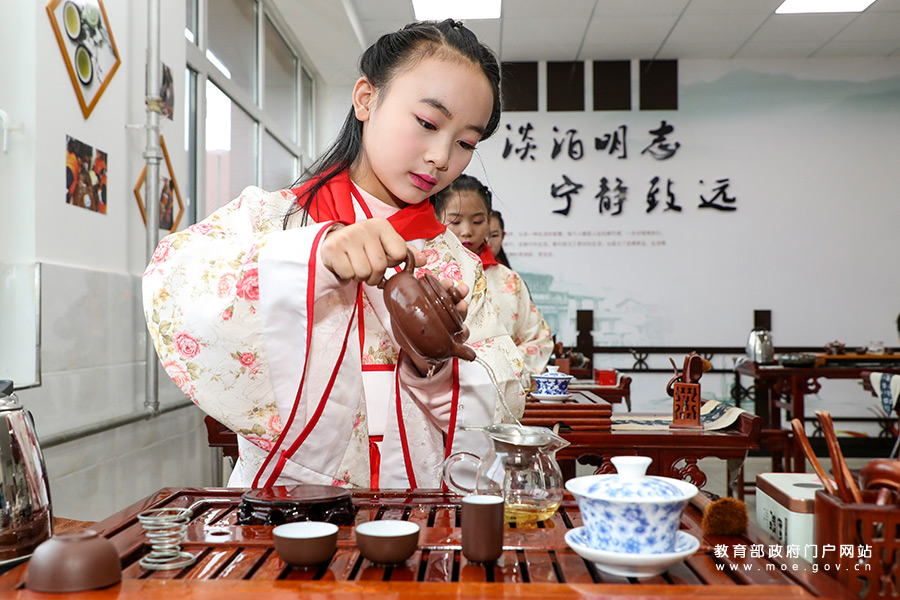 1/0長(zhǎng)治市長(zhǎng)子縣東方紅學(xué)校茶藝社團(tuán)六年級(jí)學(xué)生秦子建同學(xué)進(jìn)行茶藝十八道表演。(張勁松/攝 張勁松/文)