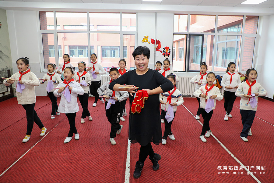 1/0長(zhǎng)治市長(zhǎng)子縣東方紅學(xué)校聘請(qǐng)的專業(yè)戲曲老師帶領(lǐng)戲曲社團(tuán)的學(xué)生們?cè)谂啪毶宵h梆子傳統(tǒng)曲目《買水》。(張勁松/攝 張勁松/文)