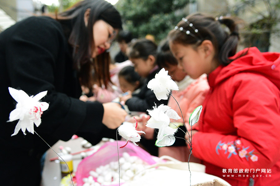 1/0志愿者在指導(dǎo)小朋友用廢舊蠶繭制作工藝品。(石玉成/攝)