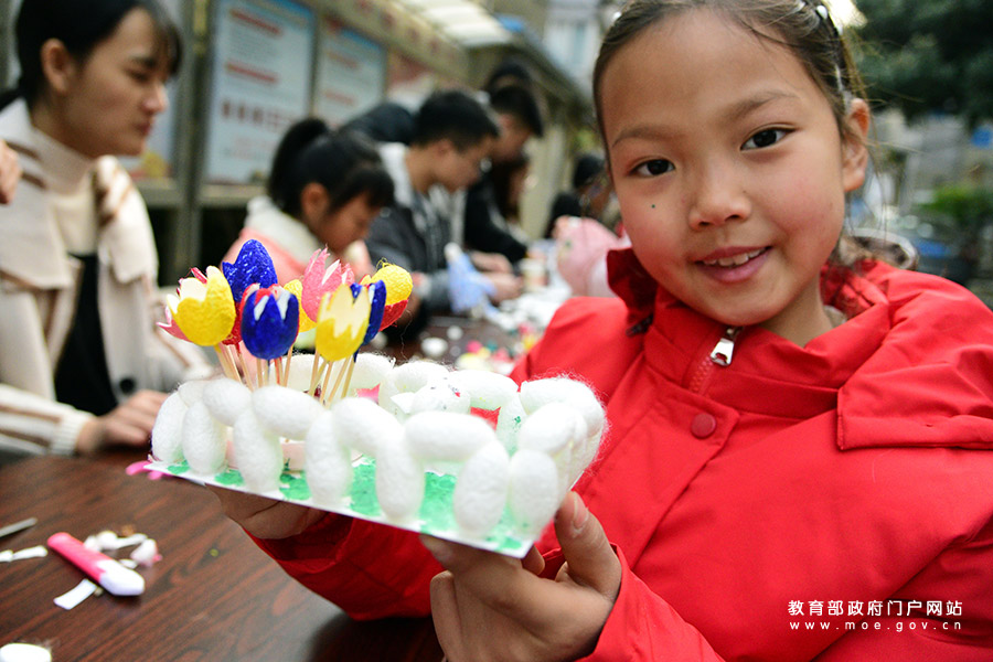 1/0小朋友在展示用廢舊蠶繭制作的工藝品。(石玉成/攝)