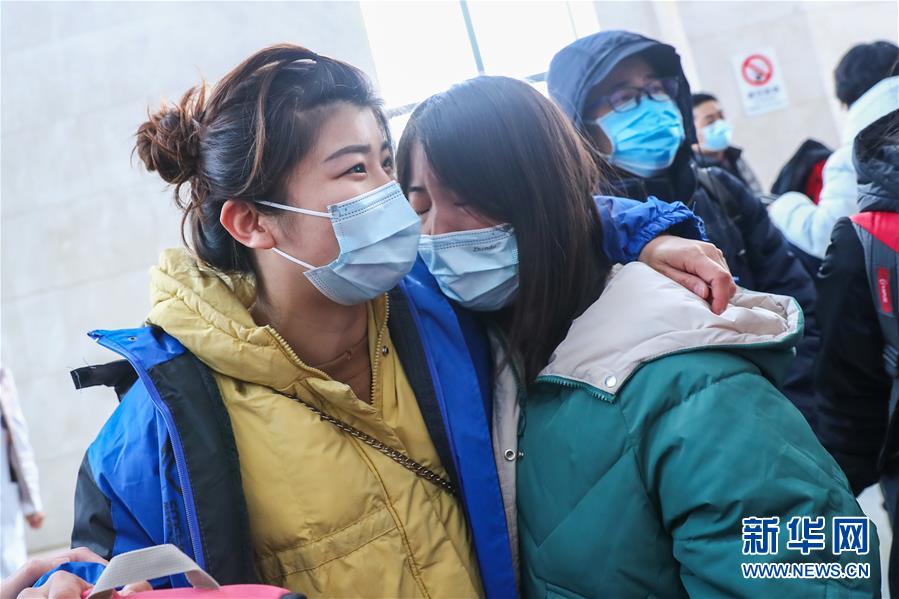 1/02月6日,北京大學(xué)國際醫(yī)院醫(yī)療隊隊員蘭爽(左一)出發(fā)前安慰前來送行的親友。(新華社記者 張玉薇/攝)