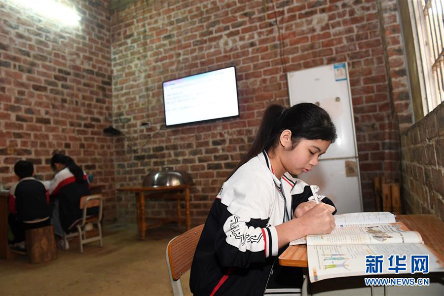 1/03月12日,在廣西南寧市武鳴區(qū)太平鎮(zhèn)慶樂村幸福屯,貧困家庭學生黃鈺曼(右)和黃鈺茵(中)、黃迪徽在“空中課堂”授課間隙自習。(新華社記者 陸波岸/攝)