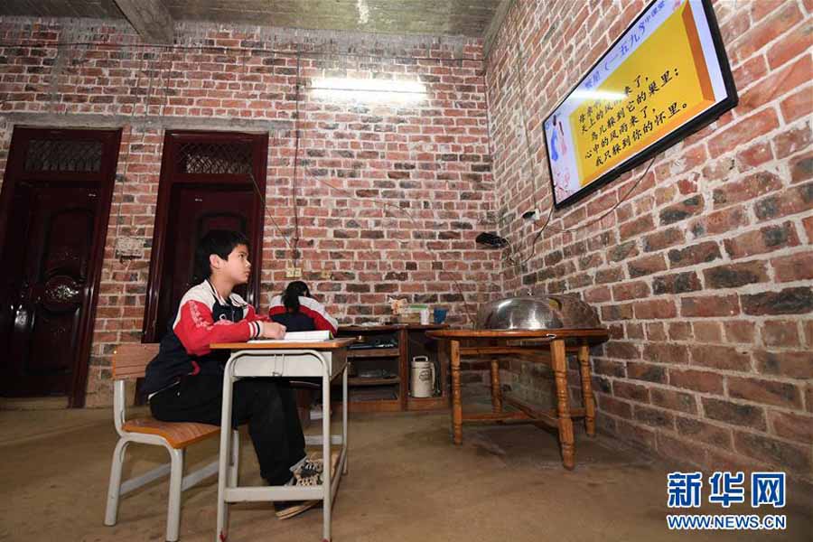 1/03月12日,在廣西南寧市武鳴區(qū)太平鎮(zhèn)慶樂村幸福屯,貧困家庭學生黃迪徽在家中通過電視學習“空中課堂”課程。(新華社記者 陸波岸/攝)