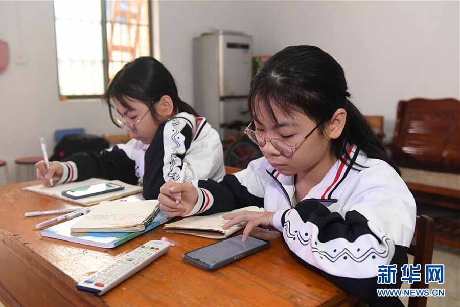 1/03月12日,在廣西南寧市武鳴區(qū)太平鎮(zhèn)慶樂村顯昌屯,貧困家庭學生黃捷(右)、黃敏在家中通過手機播放“空中課堂”課程。(新華社記者 陸波岸/攝)