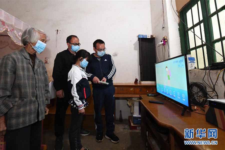 1/03月12日,在廣西南寧市武鳴區(qū)太平鎮(zhèn)慶樂村幸福屯,貧困家庭學生黃迪徽在跟著“空中課堂”做眼保健操。廣西南寧市武鳴區(qū)在實施“空中課堂”工作中,針對部分建檔立卡貧困家庭因缺設(shè)備、無網(wǎng)絡(luò)等原因無法正常參加網(wǎng)上在線學習,由幫扶單位及幫扶責任人負責統(tǒng)籌解決,提供智能手機、電視、機頂盒等設(shè)備,并上門指導安裝服務(wù),確保學生正常參加在線學習。目前,武鳴區(qū)“空中課堂”已覆蓋建檔立卡貧困家庭學生。(新華社記者 陸波岸/攝)