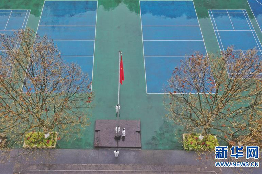 1/03月16日,貴陽(yáng)市第六中學(xué)國(guó)旗班學(xué)生在操場(chǎng)上升旗,其余同學(xué)則在教室內(nèi)參加升旗儀式。(新華社記者 歐東衢/攝)