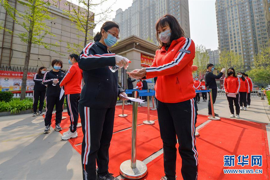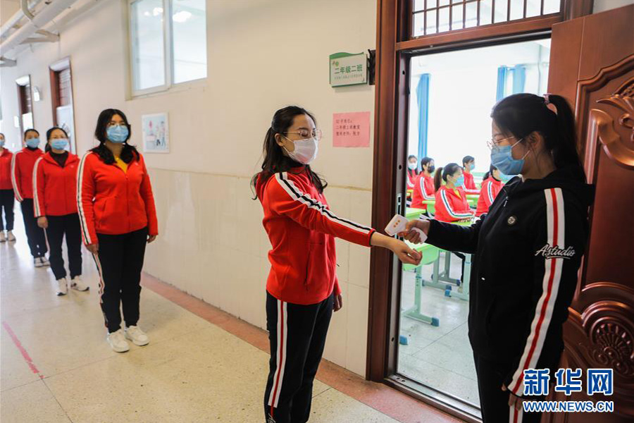 1/04月7日,邯鄲市邯山區(qū)趙王小學(xué)教師在演練中模擬學(xué)生接受體溫測(cè)量。(新華社記者 王曉/攝)