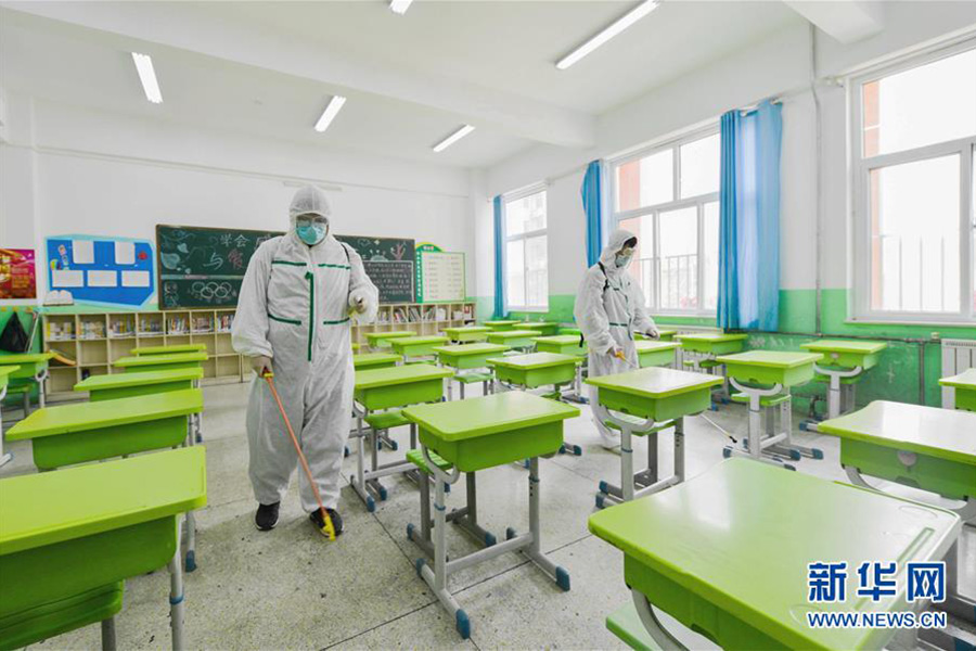 1/04月7日,防疫人員在邯鄲市邯山區(qū)趙王小學(xué)教室內(nèi)進(jìn)行消殺。(新華社記者 王曉/攝)