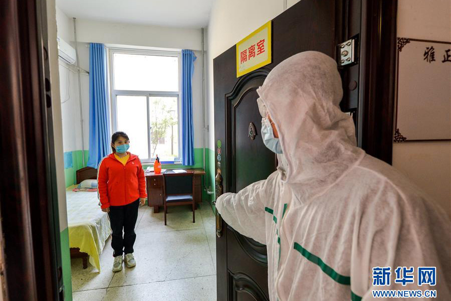1/04月7日,防疫人員在邯鄲市邯山區(qū)趙王小學(xué)演練將“發(fā)熱學(xué)生”安置在隔離室。(新華社記者 王曉/攝)