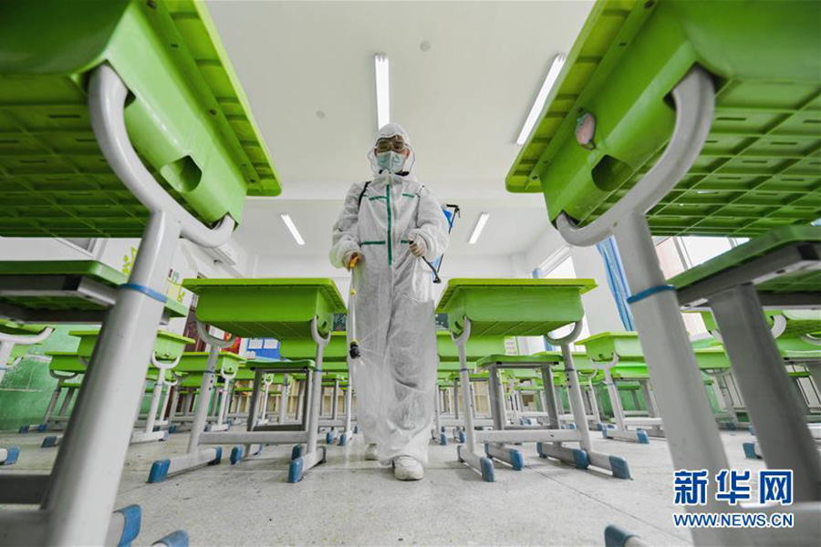 1/04月7日,湖南省永州市零陵區(qū)柳子中學的學生進入食堂前消毒。(新華社發(fā) 潘愛民/攝)