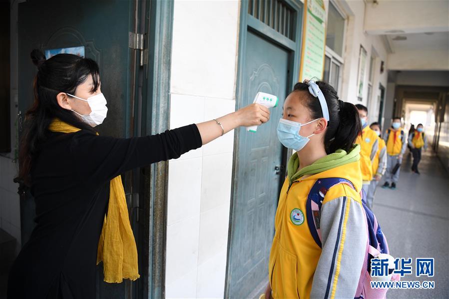 1/04月26日,合肥市肥西縣紫蓬鎮(zhèn)中心學(xué)校學(xué)生入校接受體溫測量。當(dāng)日,安徽省合肥市小學(xué)四、五、六年級及高一、初一年級開學(xué)復(fù)課。(新華社記者 劉軍喜/攝)