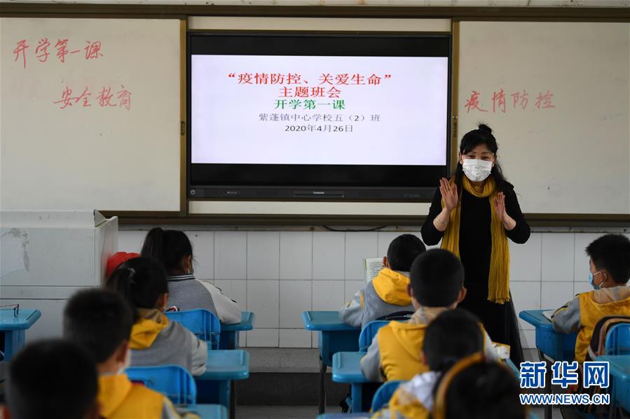 1/04月26日,合肥市肥西縣紫蓬鎮(zhèn)中心學(xué)校老師在為學(xué)生上開學(xué)第一課。(新華社記者 劉軍喜/攝)