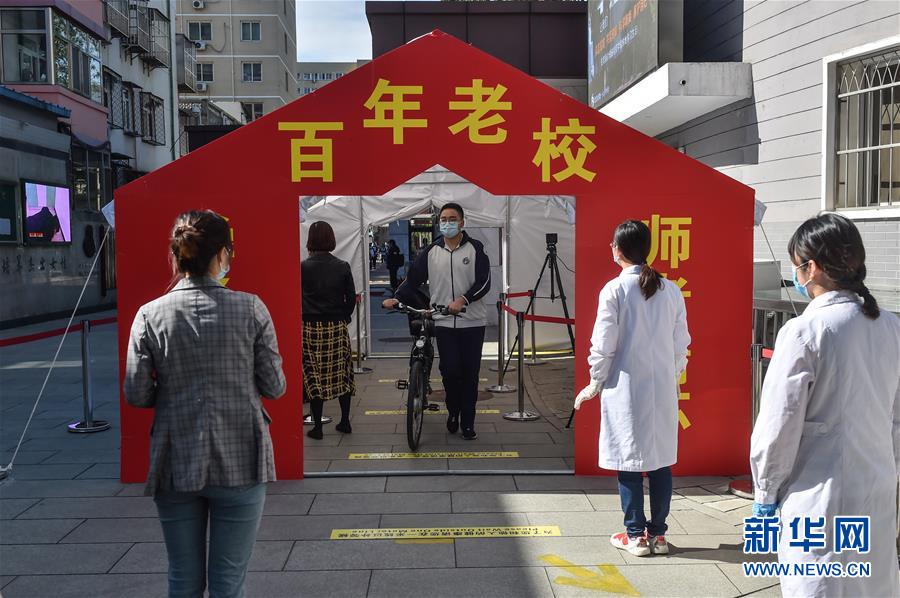 1/05月11日,北京市第一六六中學(xué)的學(xué)生通過測溫棚后進(jìn)入學(xué)校。(新華社記者 彭子洋/攝)