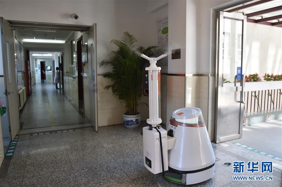 1/05月11日,在北京市第一六六中學(xué)的走廊內(nèi),消殺機(jī)器人在工作。(新華社記者 彭子洋/攝)
