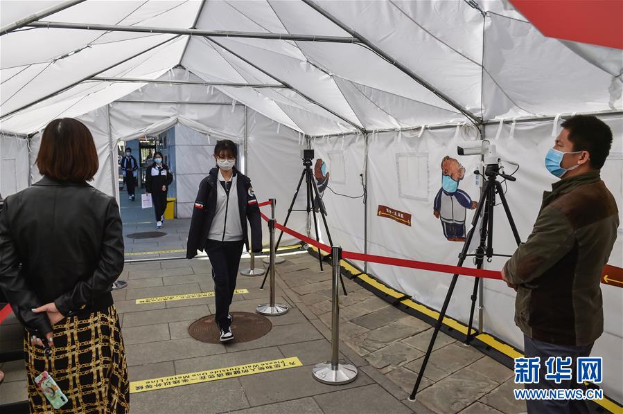 1/05月11日,北京市第一六六中學(xué)的學(xué)生通過測溫棚。(新華社記者 彭子洋/攝)