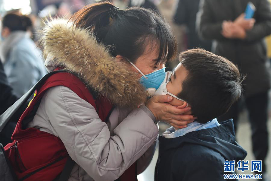 1/0山西太原武宿國(guó)際機(jī)場(chǎng),兒子與援鄂醫(yī)療隊(duì)的媽媽告別(2月20日攝)。 (新華社發(fā) 柴婷/攝)