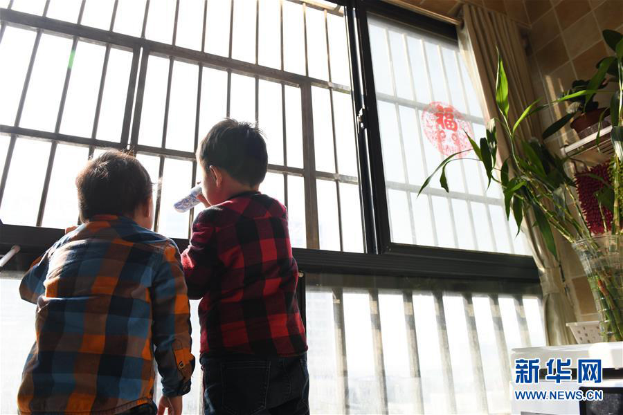 1/0合肥第二人民醫(yī)院附近,兒子在家中陽(yáng)臺(tái)手持自制“放大鏡”,眺望在對(duì)面醫(yī)院“打病毒”的護(hù)士媽媽(2月3日攝)。(新華社記者 張端/攝)