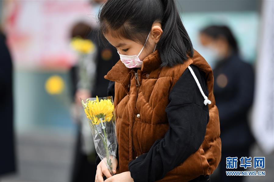 1/0安徽肥西,一名小女孩在哀悼活動(dòng)上默哀(4月4日攝)。(新華社記者 劉軍喜/攝)